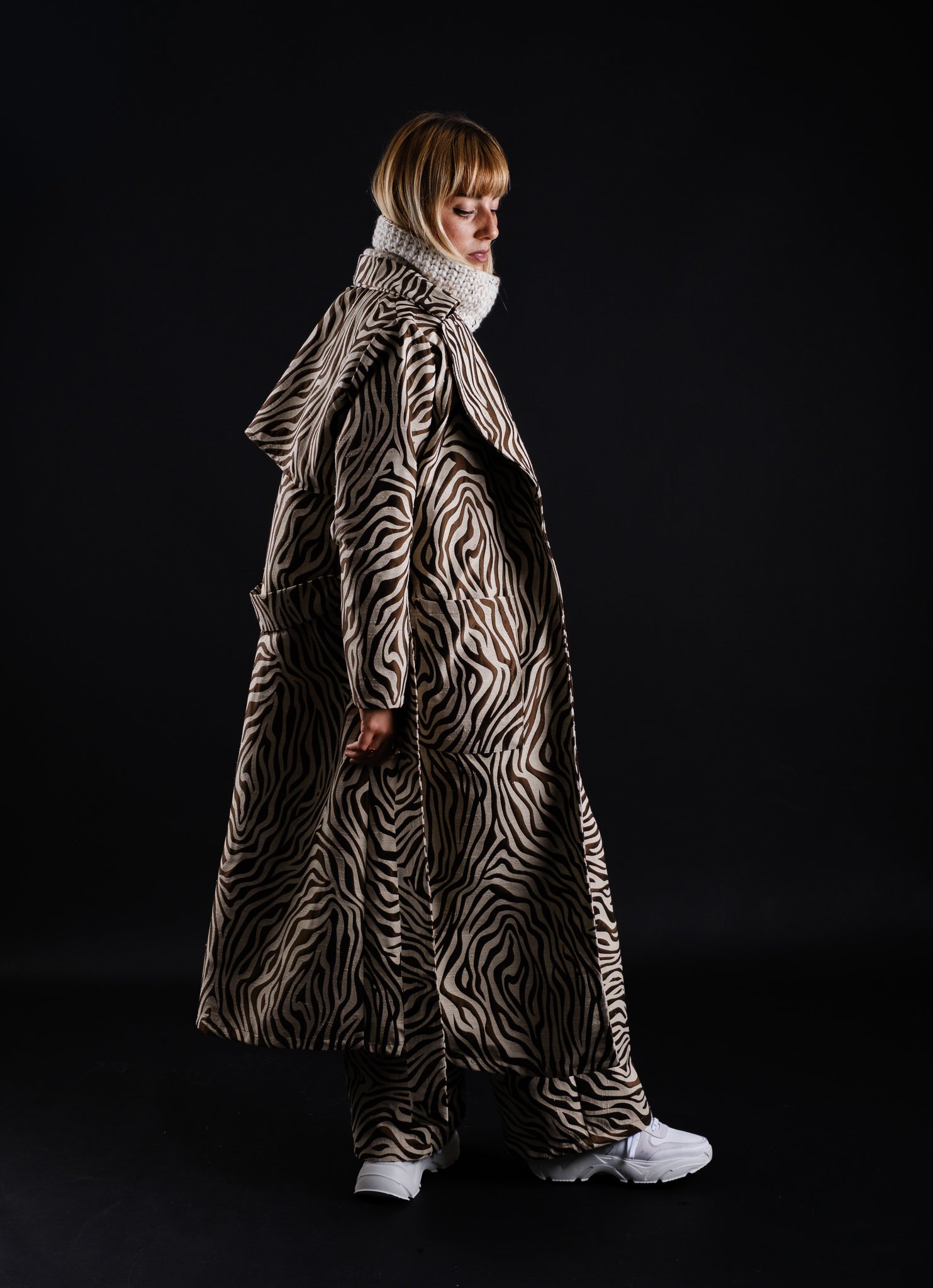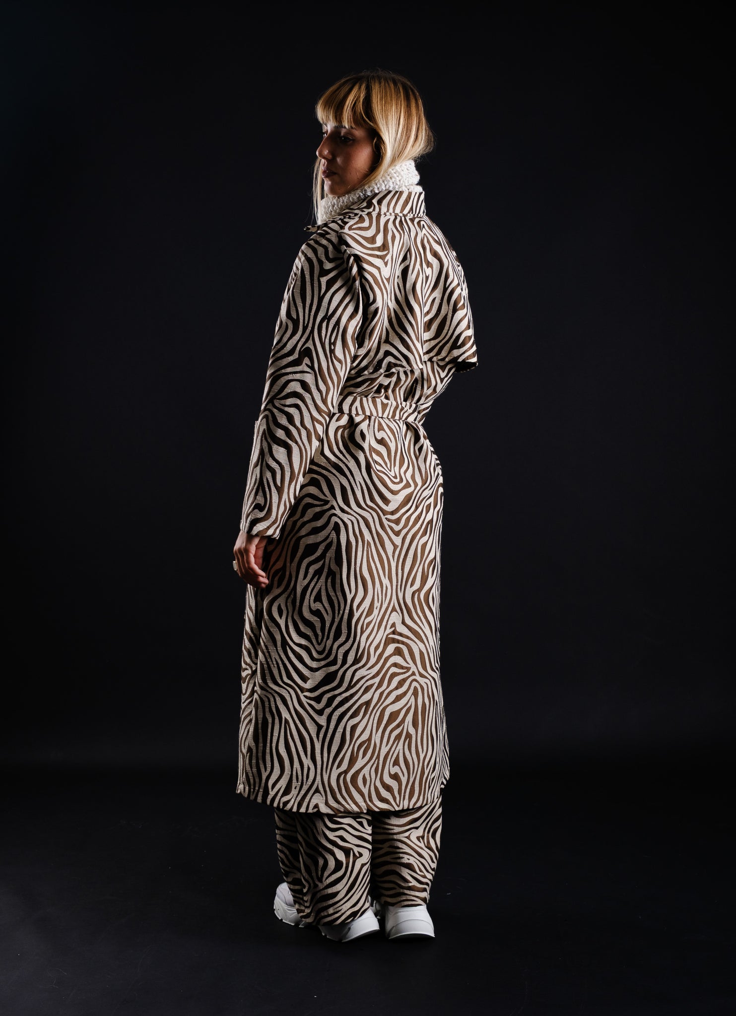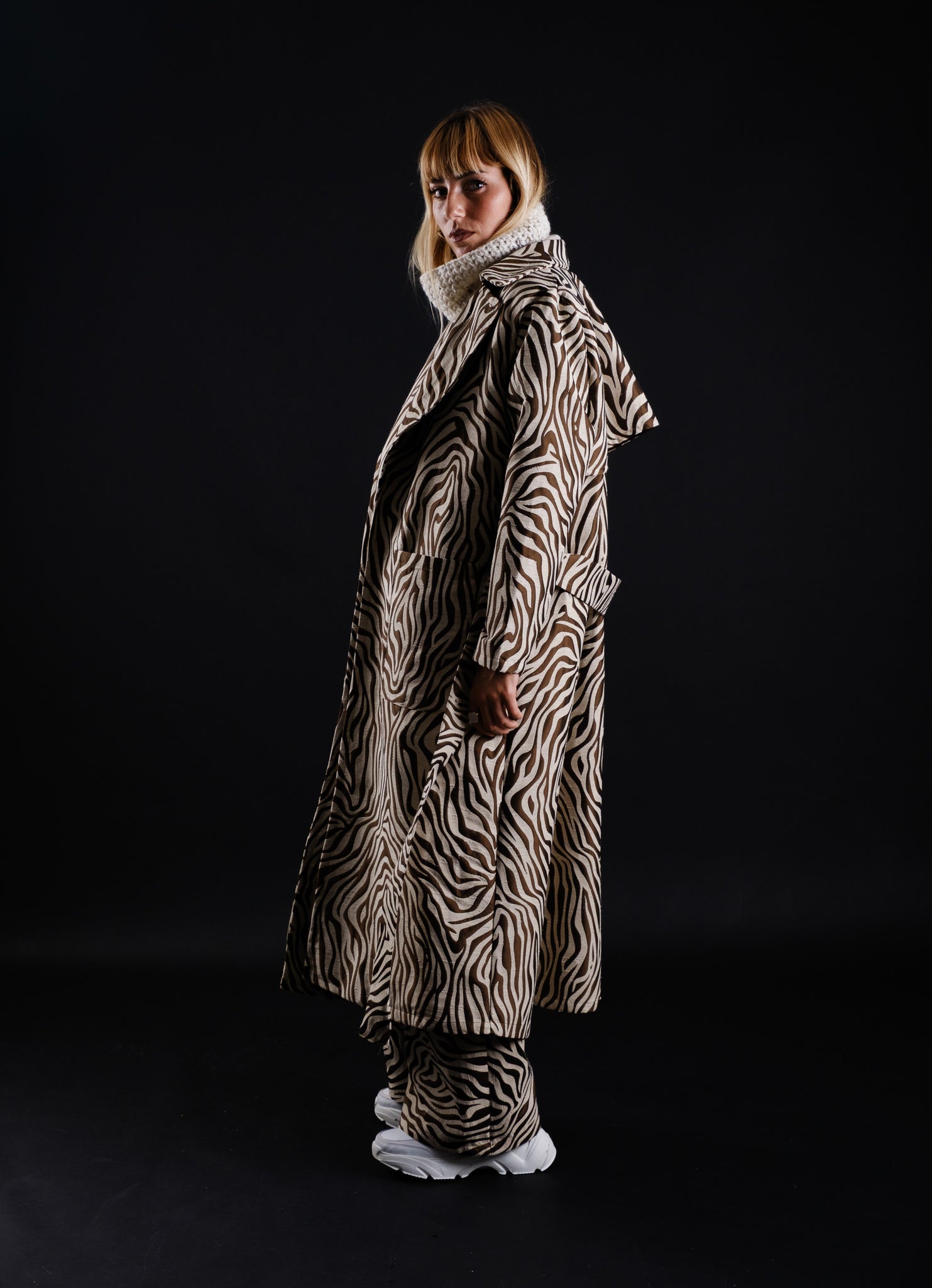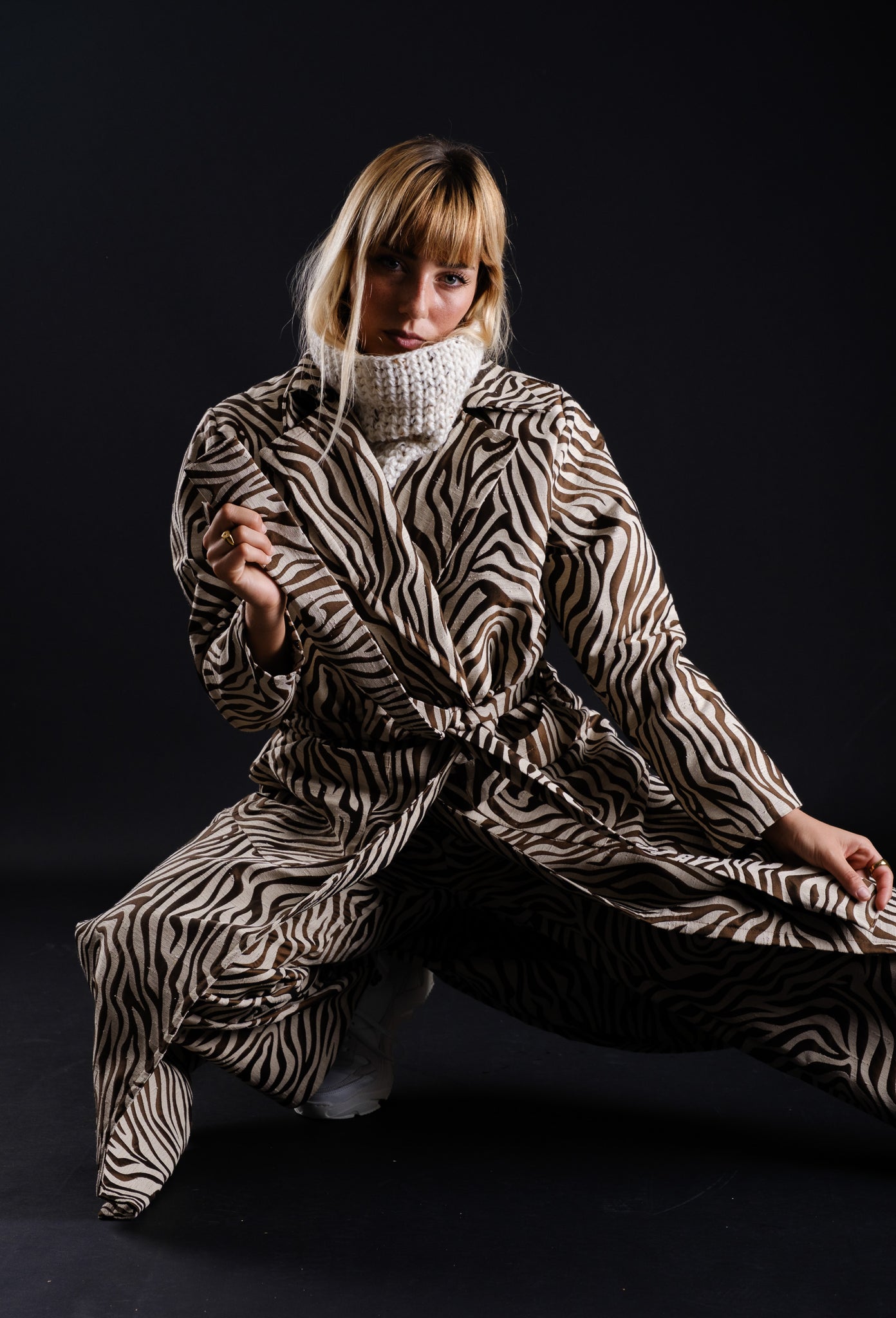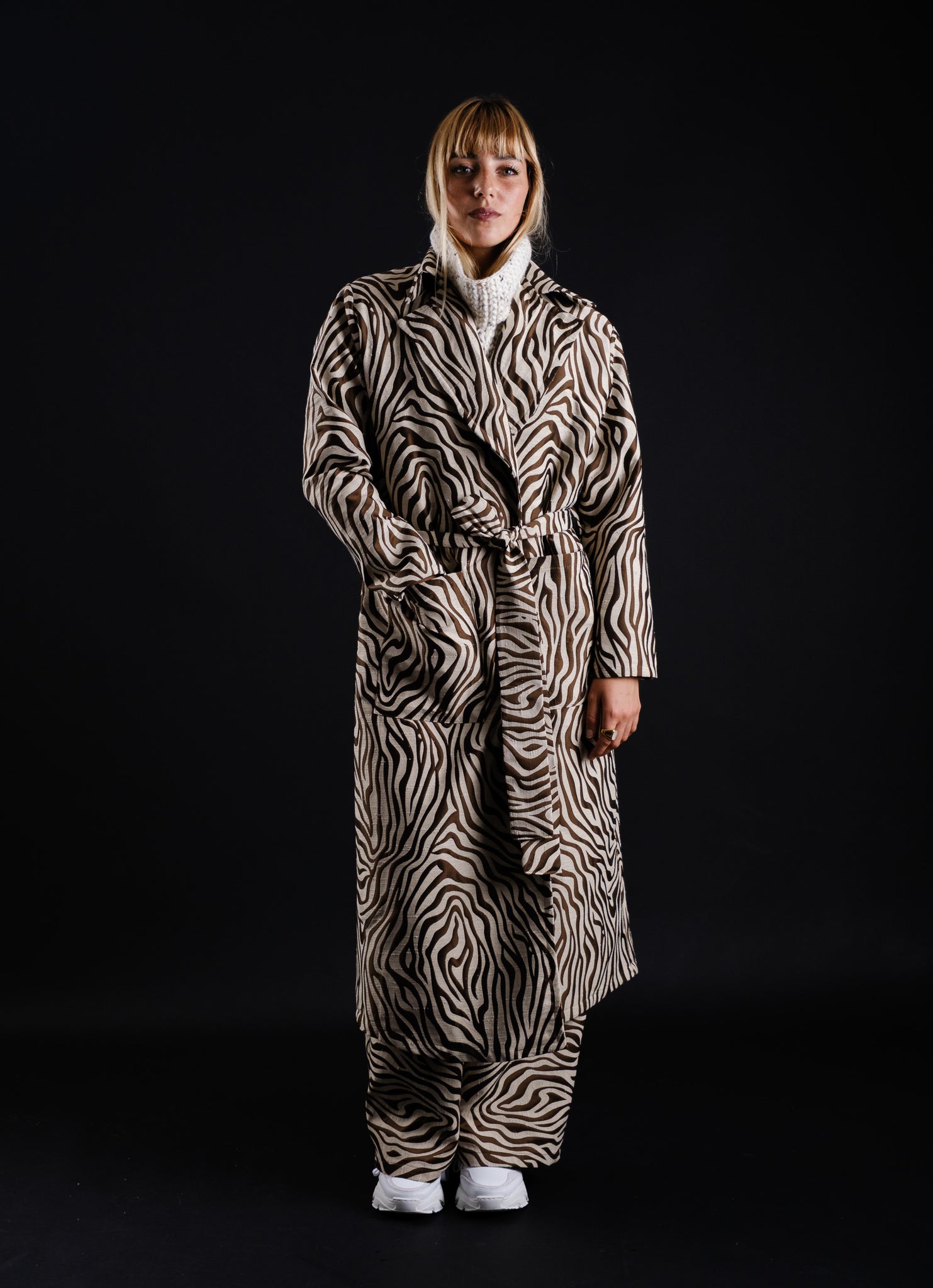 Trench coat in Zebra in a 100% cotton. Model is wearing the bigger size.