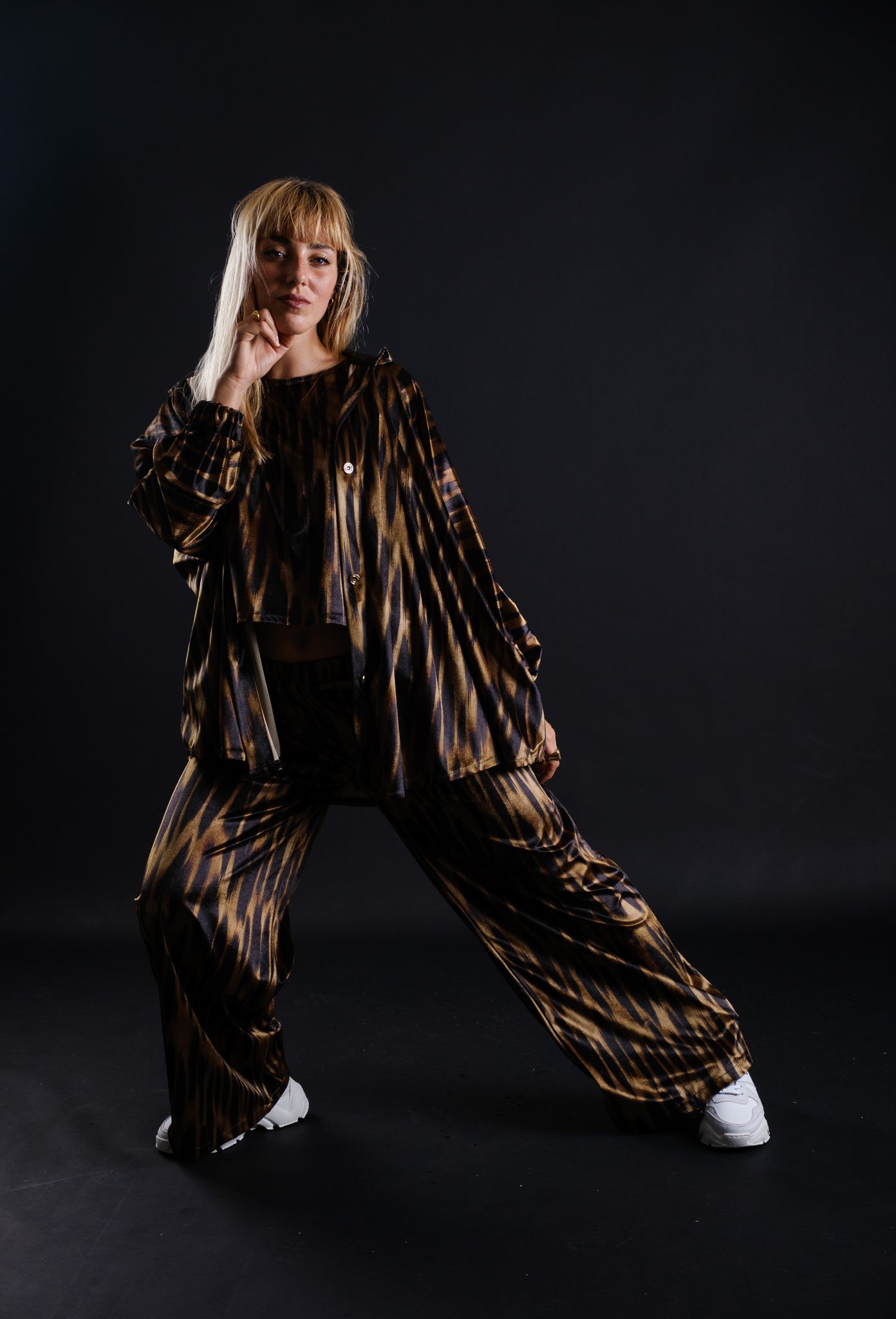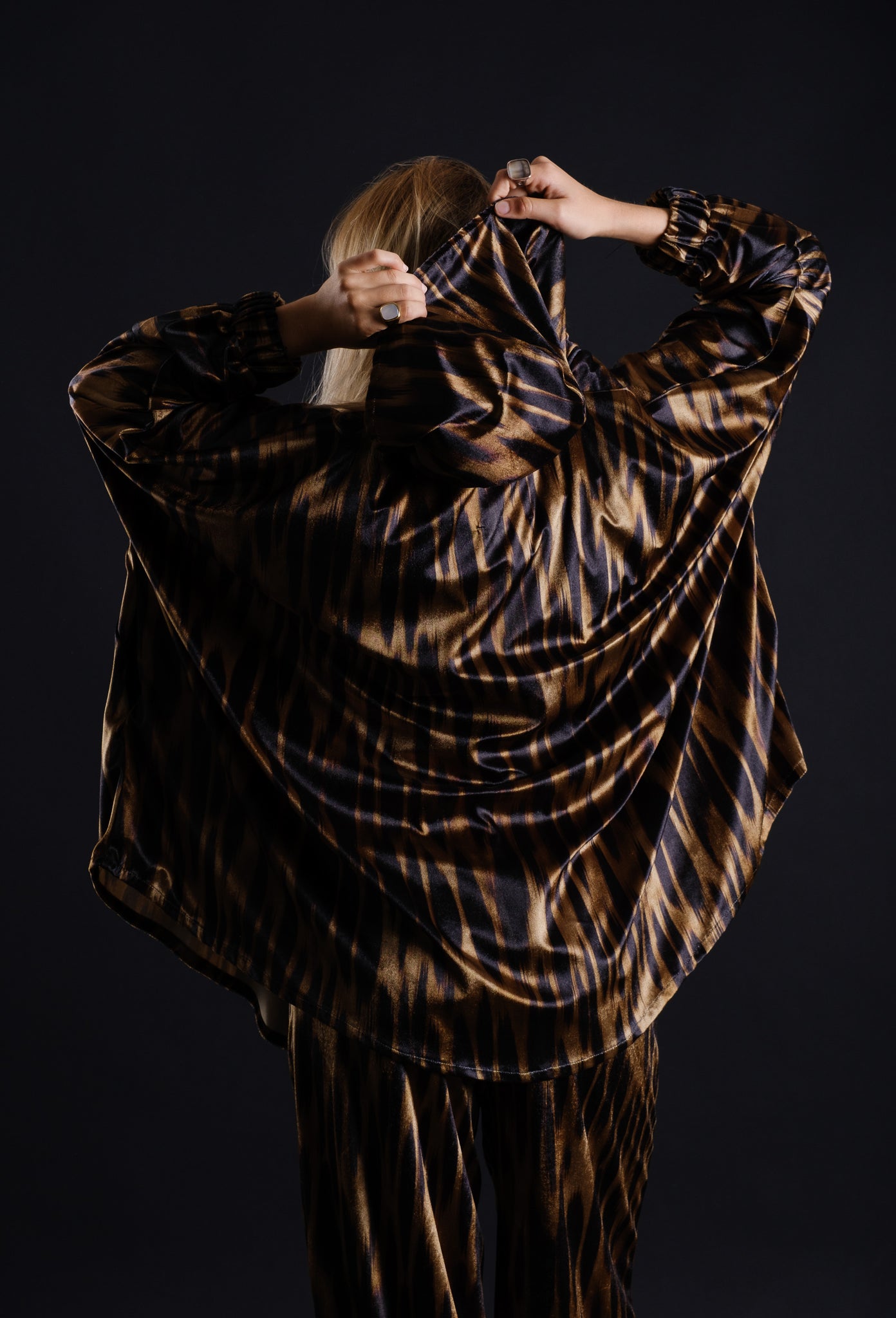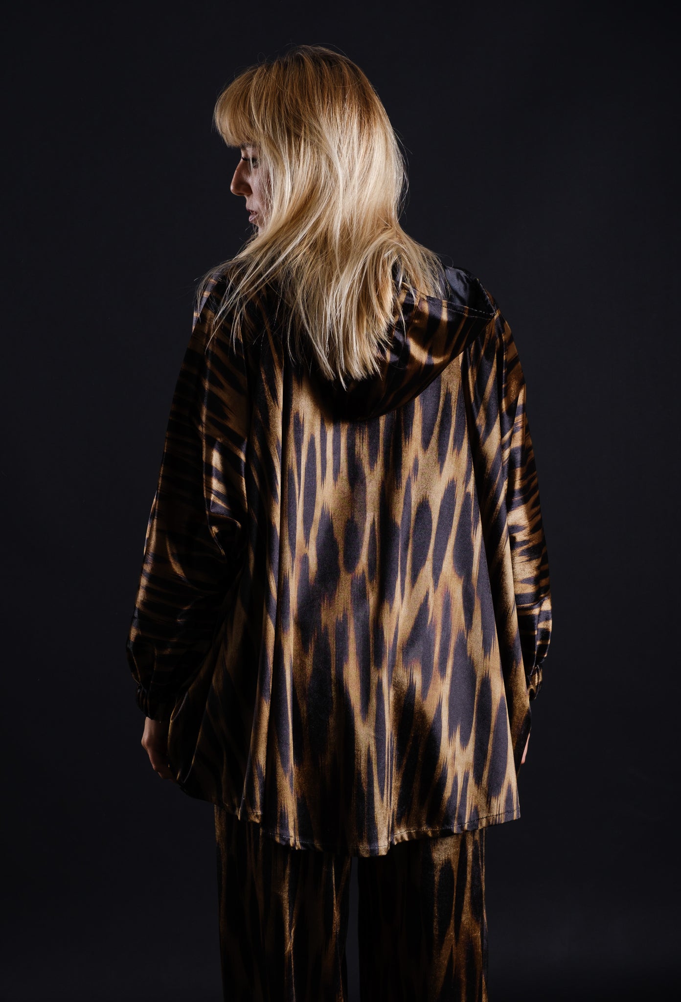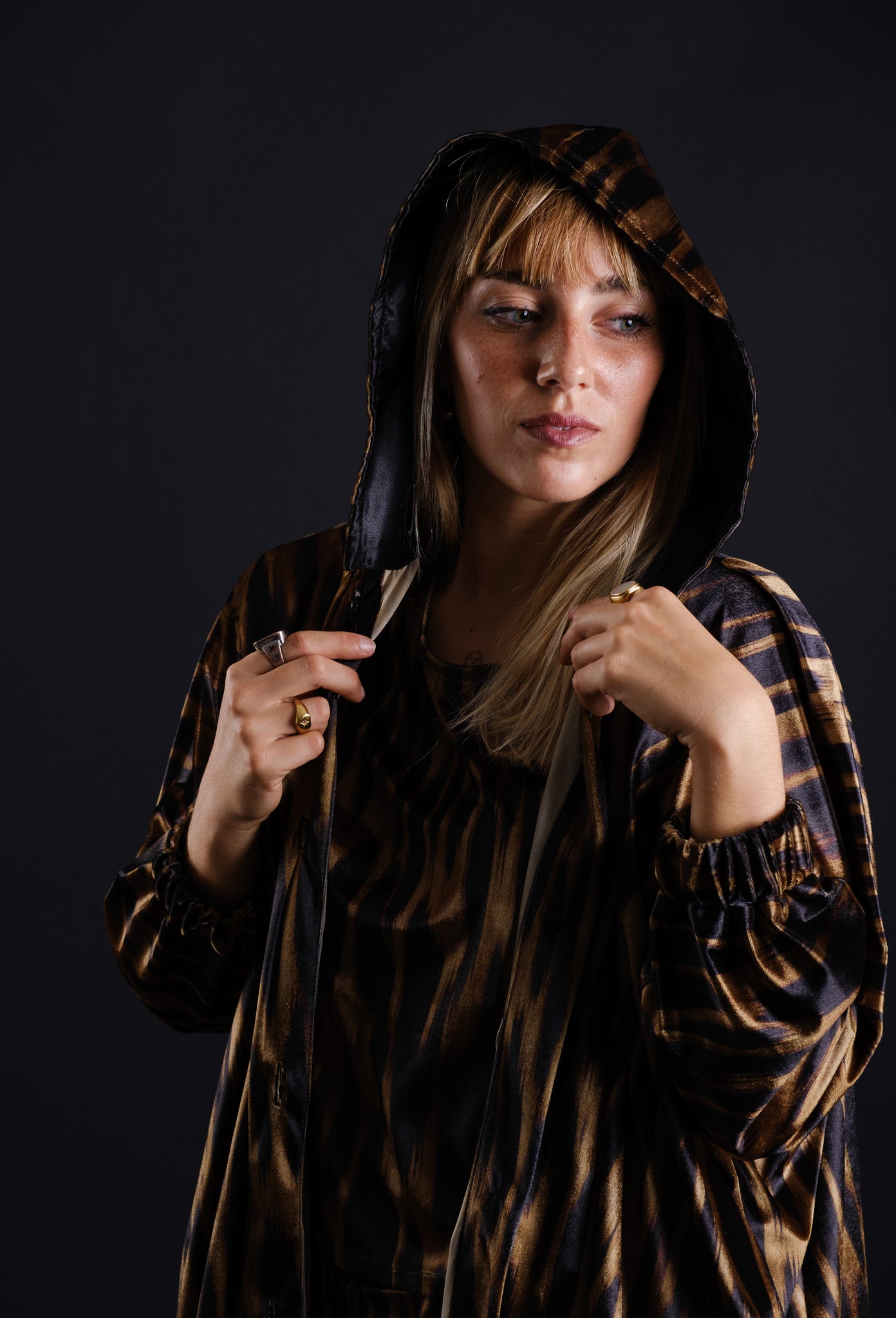 Wide velvet coat in a jersey material with pockets on the sides and a hood.