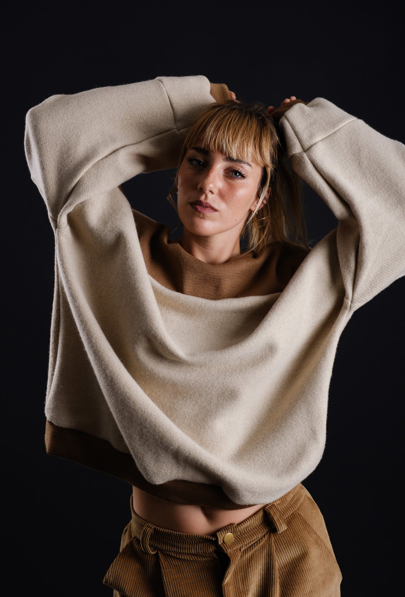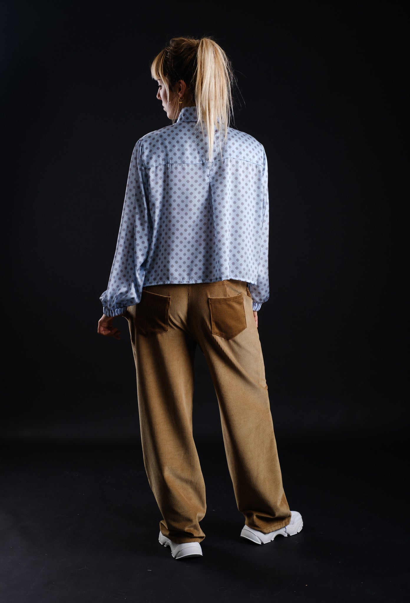 Corduroy unisex Pants with a oversize cut and a golden button and pockets in front and back.