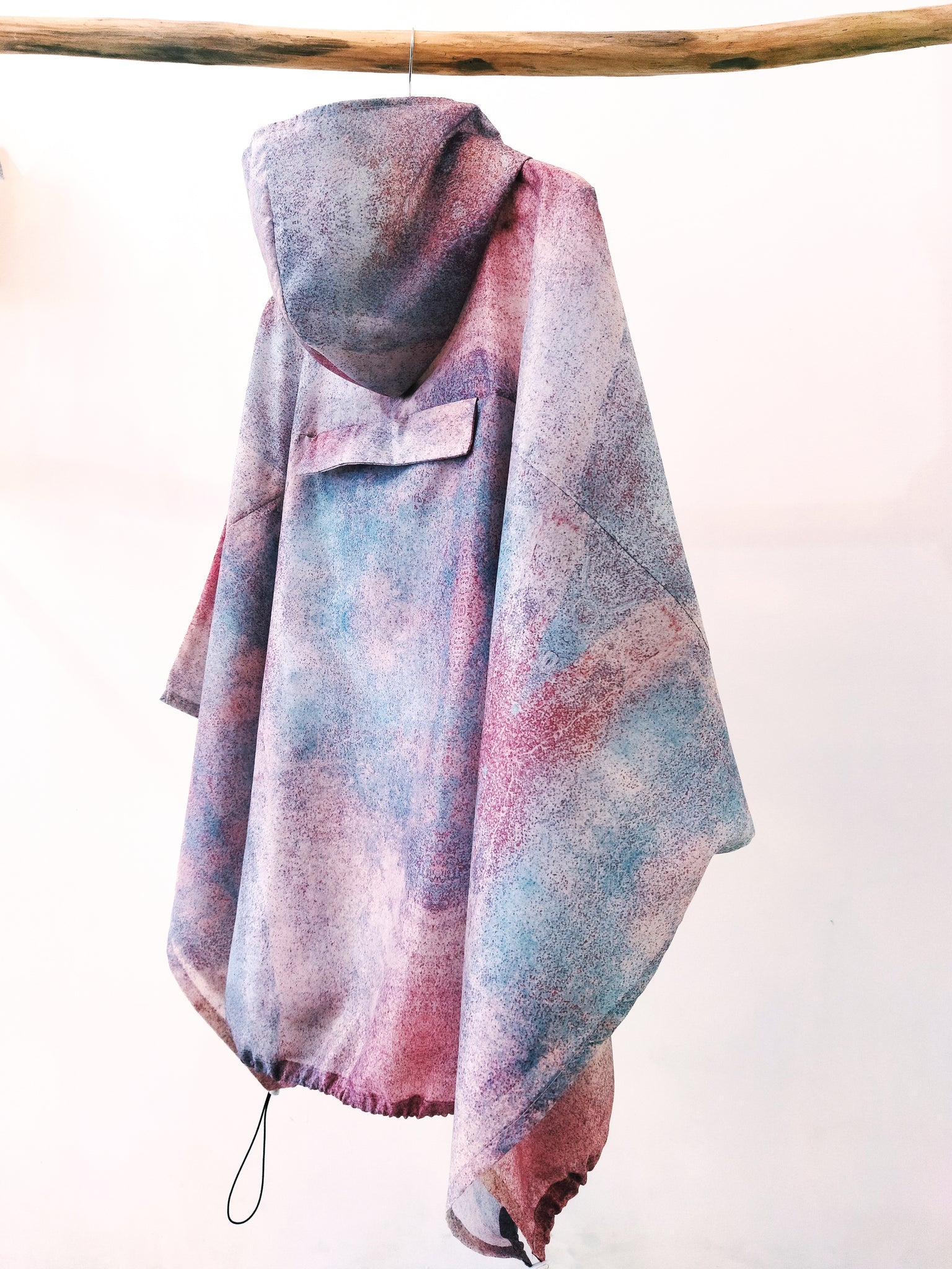 Exclusive printed fabric designed by us in this cape with sporty details, front pockets a zip on the top and a hood also adjustable with a elastic on the hem.