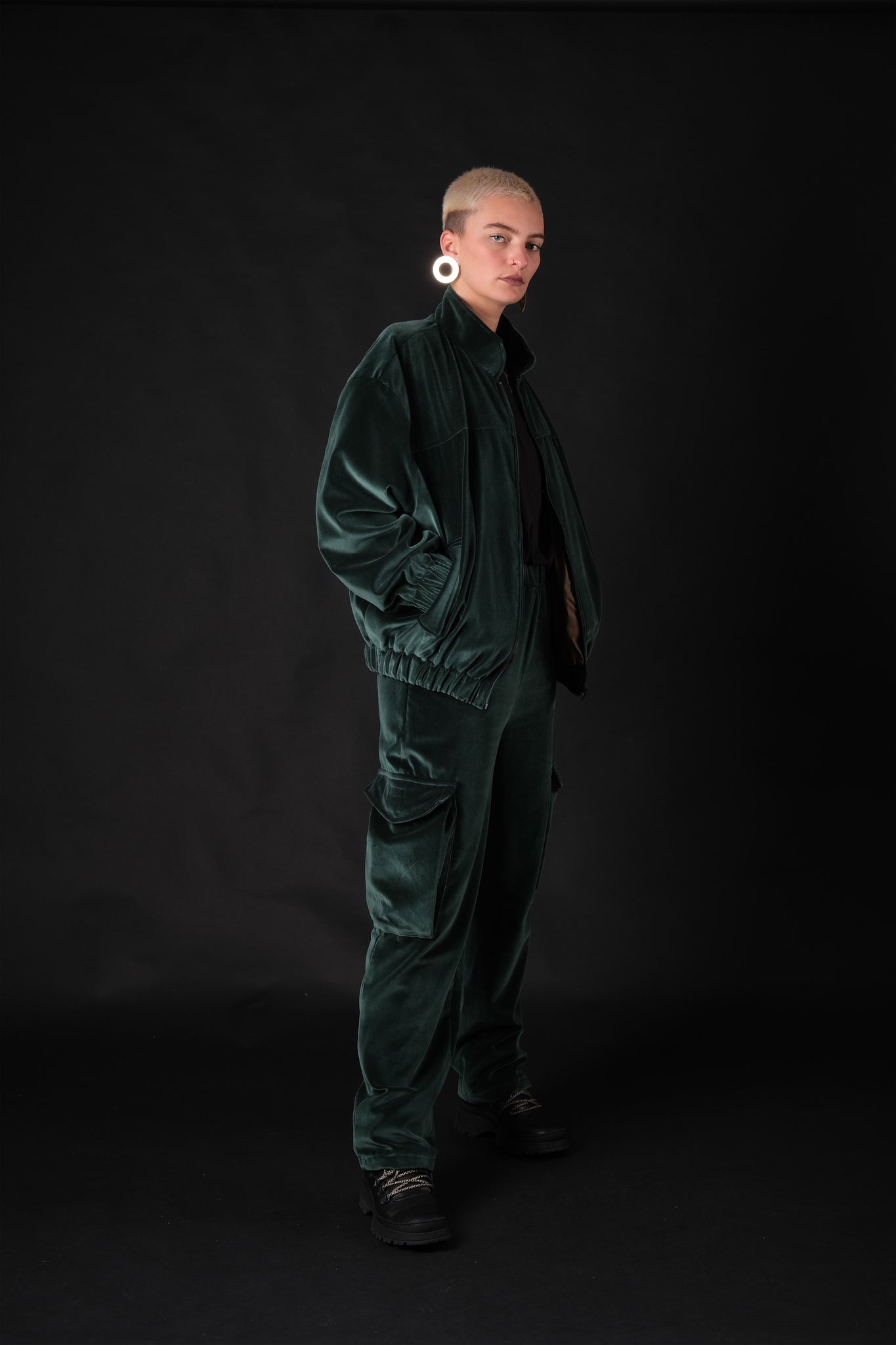Cargo trousers in this green velvet with amazing touch. Super comfortable piece and cool for eveyday. Big pockets on the sides and a elastic on the waist.