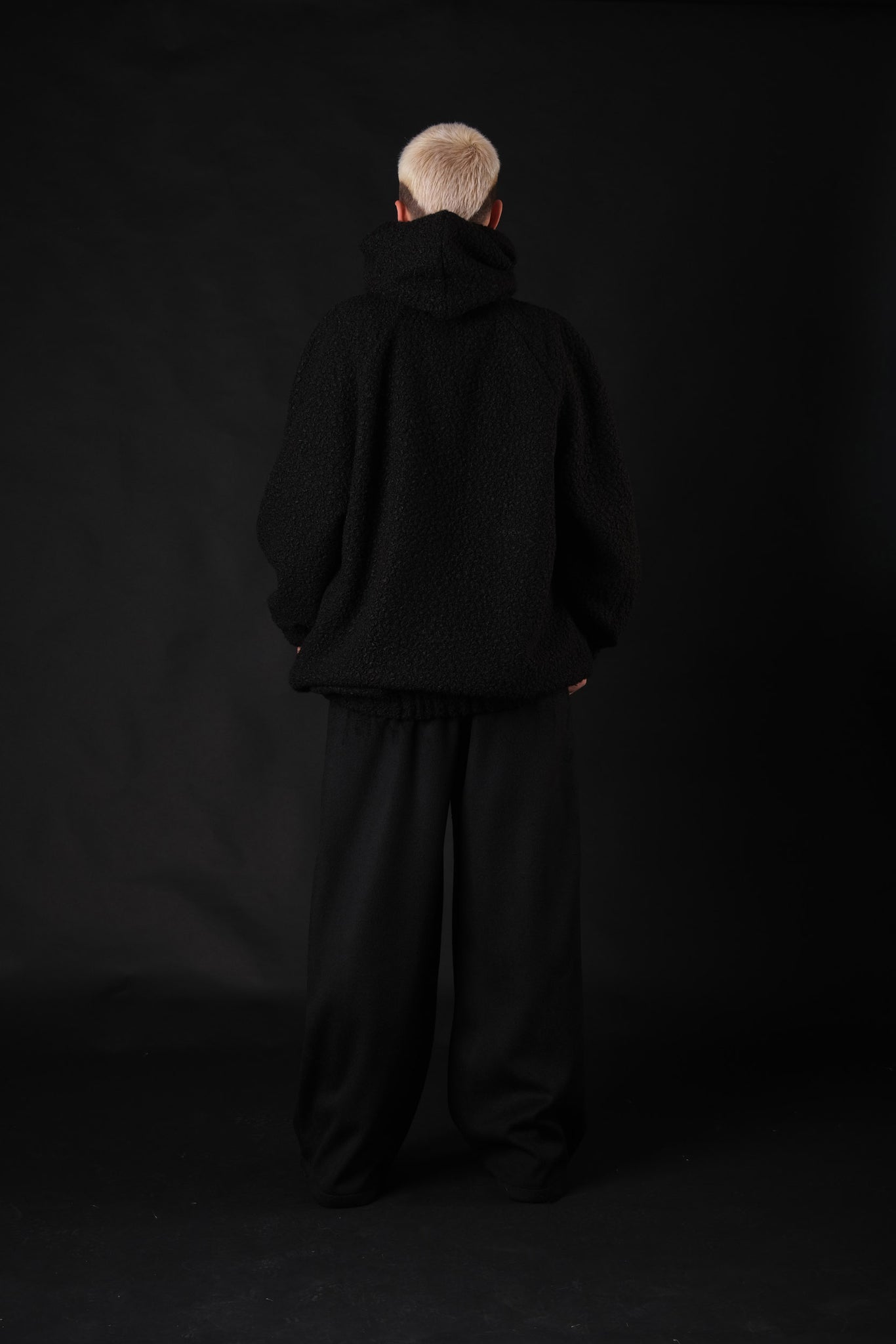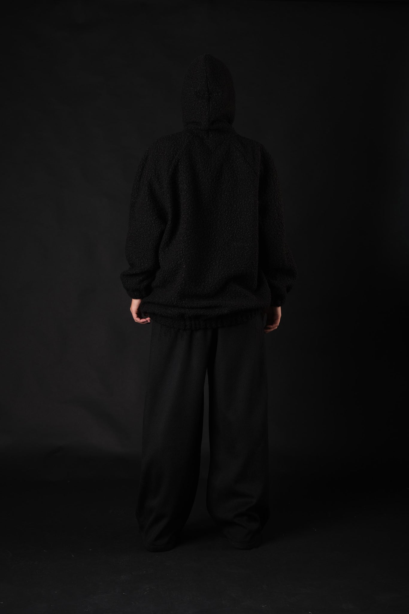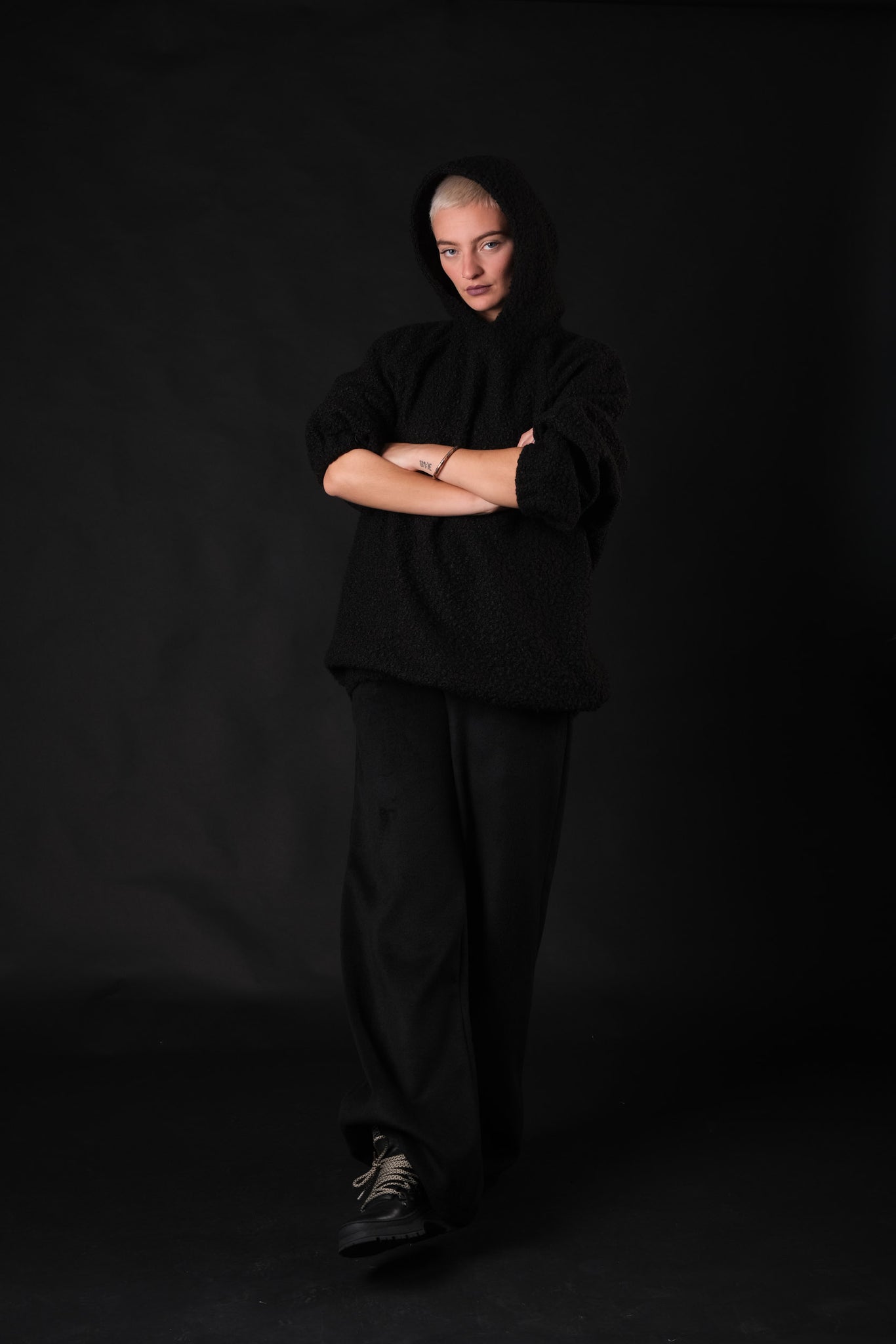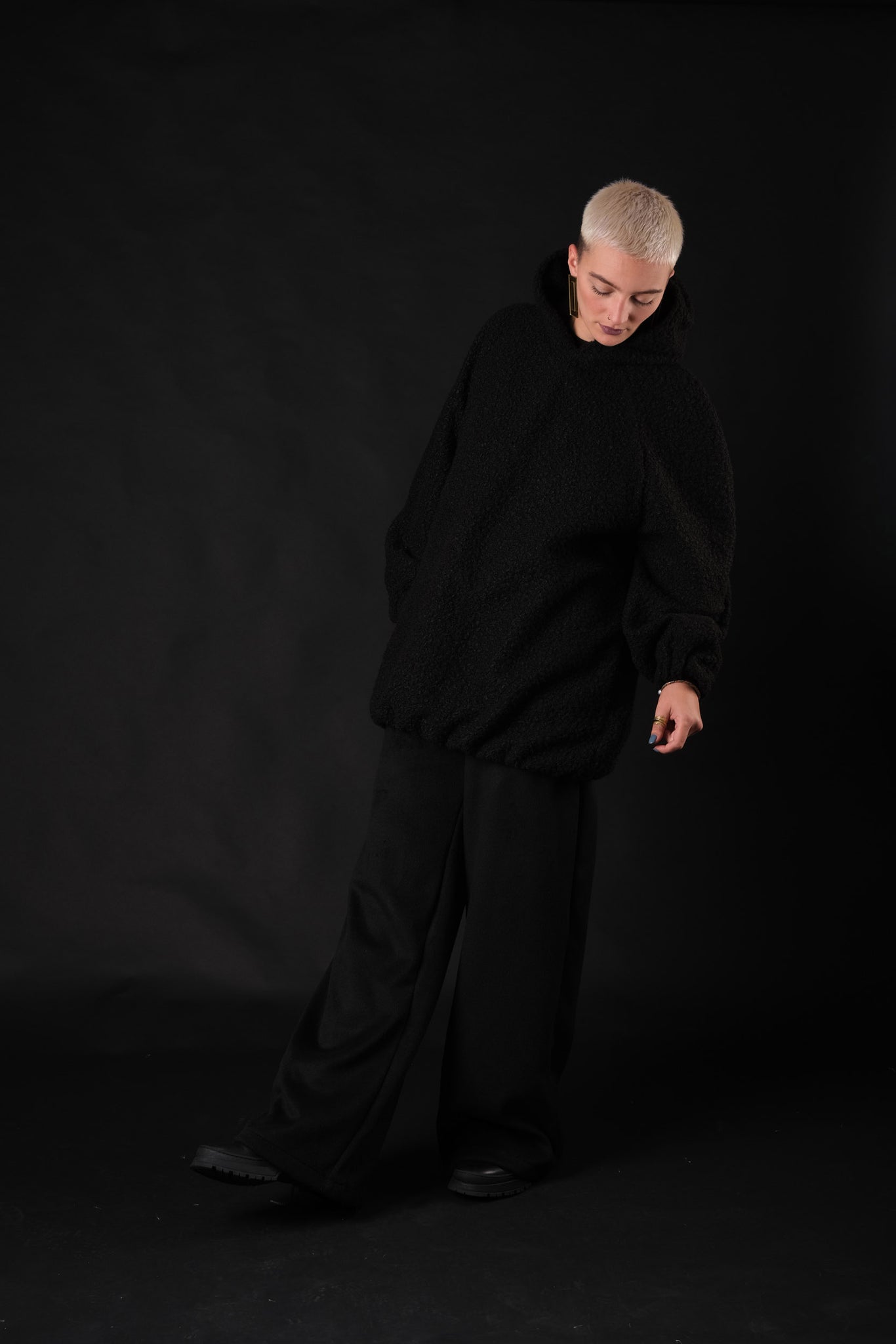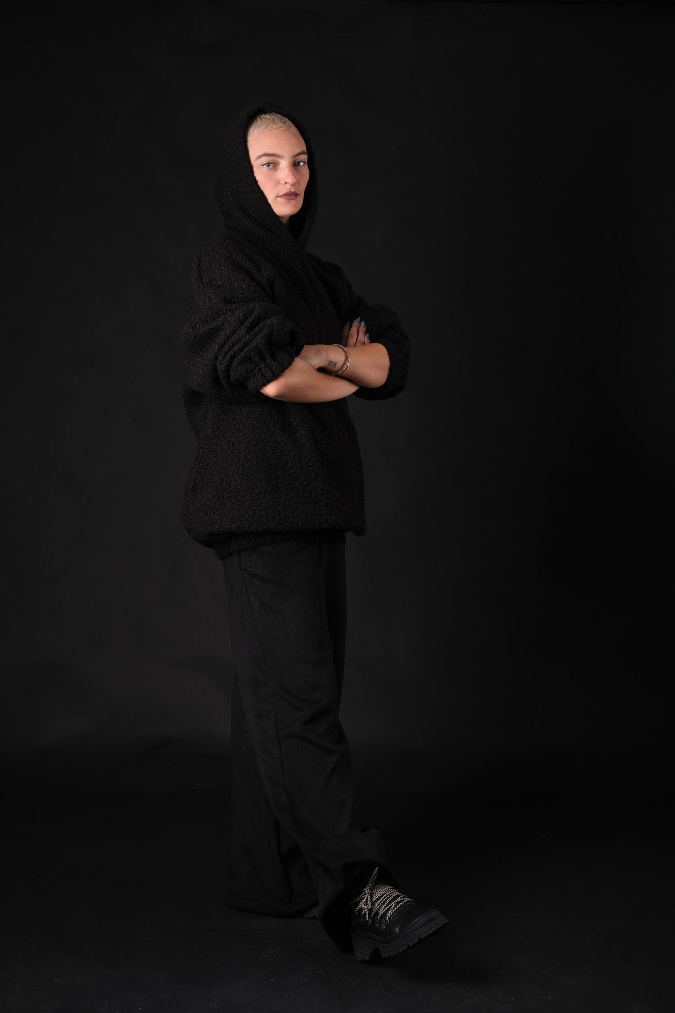 Unisex and oversize hoodie in astrakhan wool material with elastic on the bottom and cuffs. Very relaxed and cool piece for winter days.