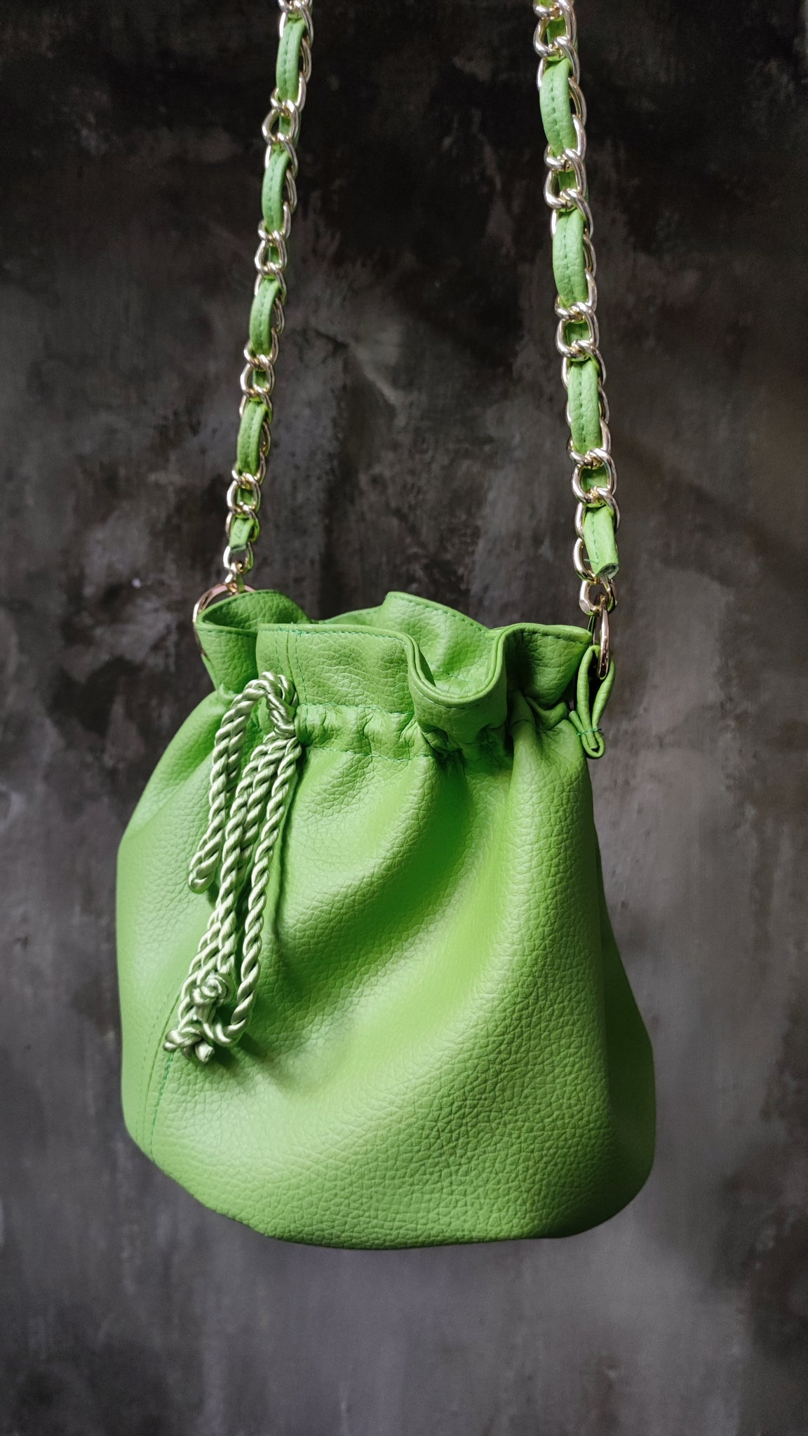 Vegan Pouch Bag with lining inside and a stainless steal chain.