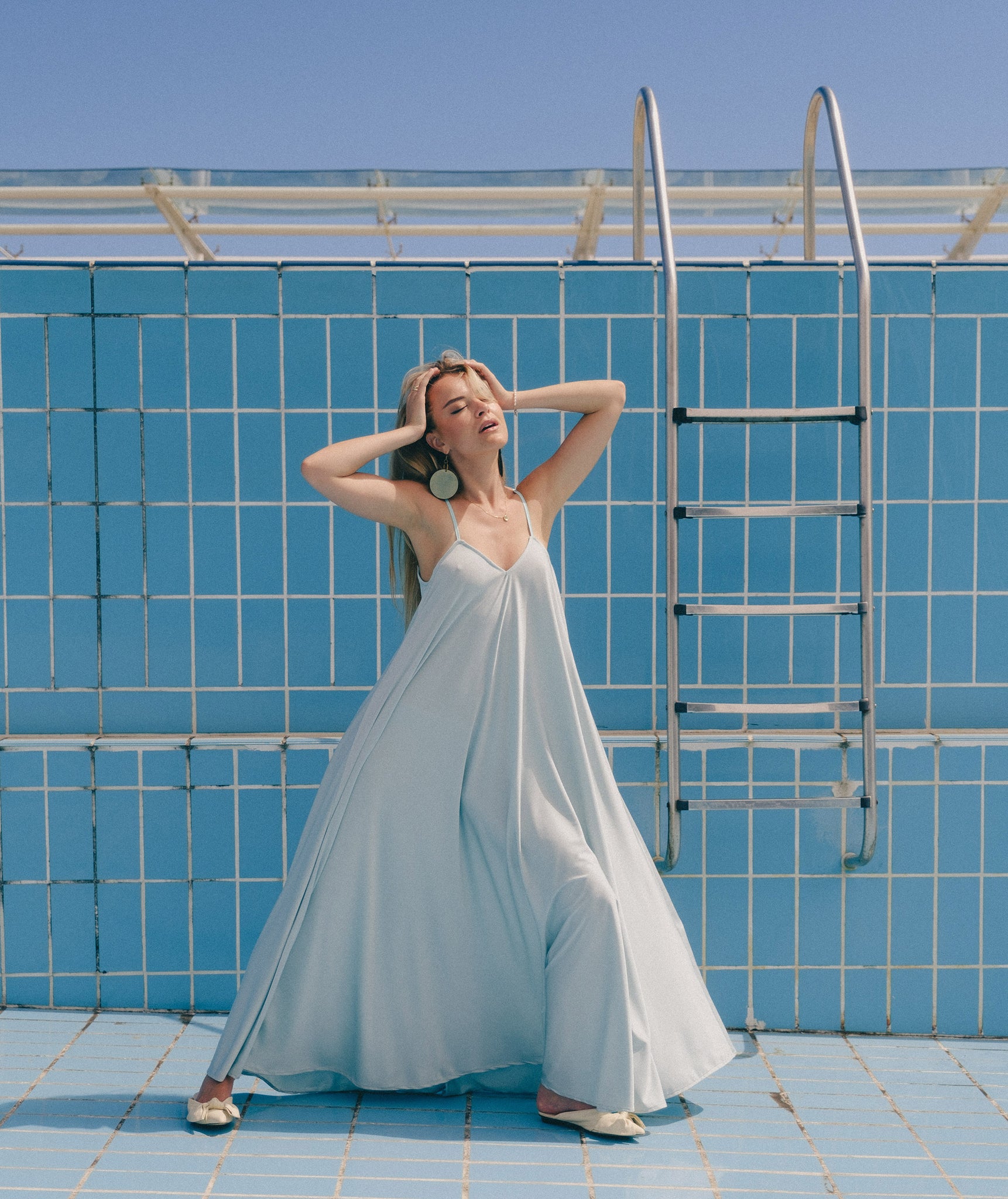 Mint long dress in a very fresh and light knit. A V on the back makes the piece elegant and chic.