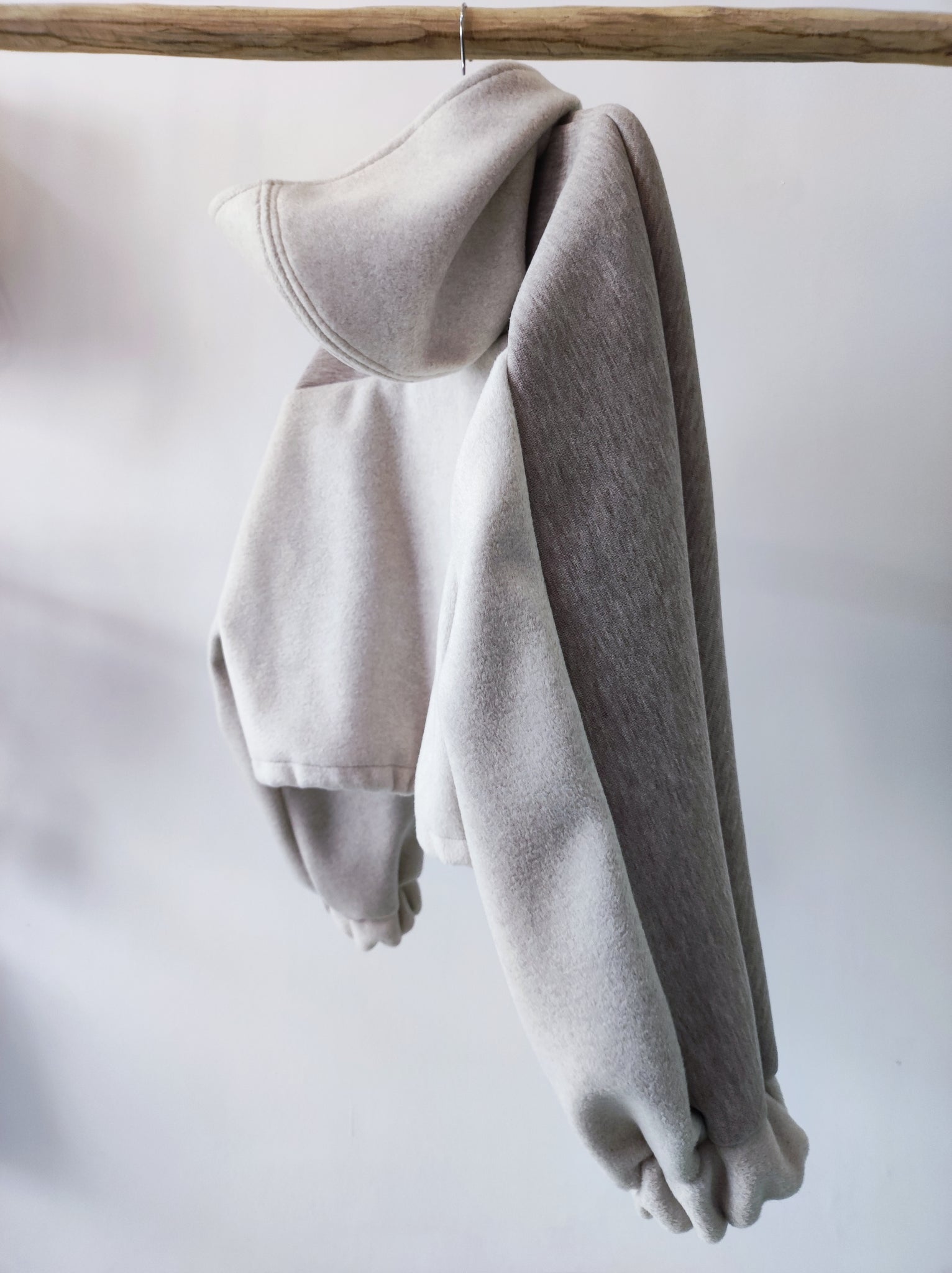 Nude oversized but cropped sweater very warm and comfy. Knit with woolen touch looking like fur with very high quality. Adjustable on the ham.