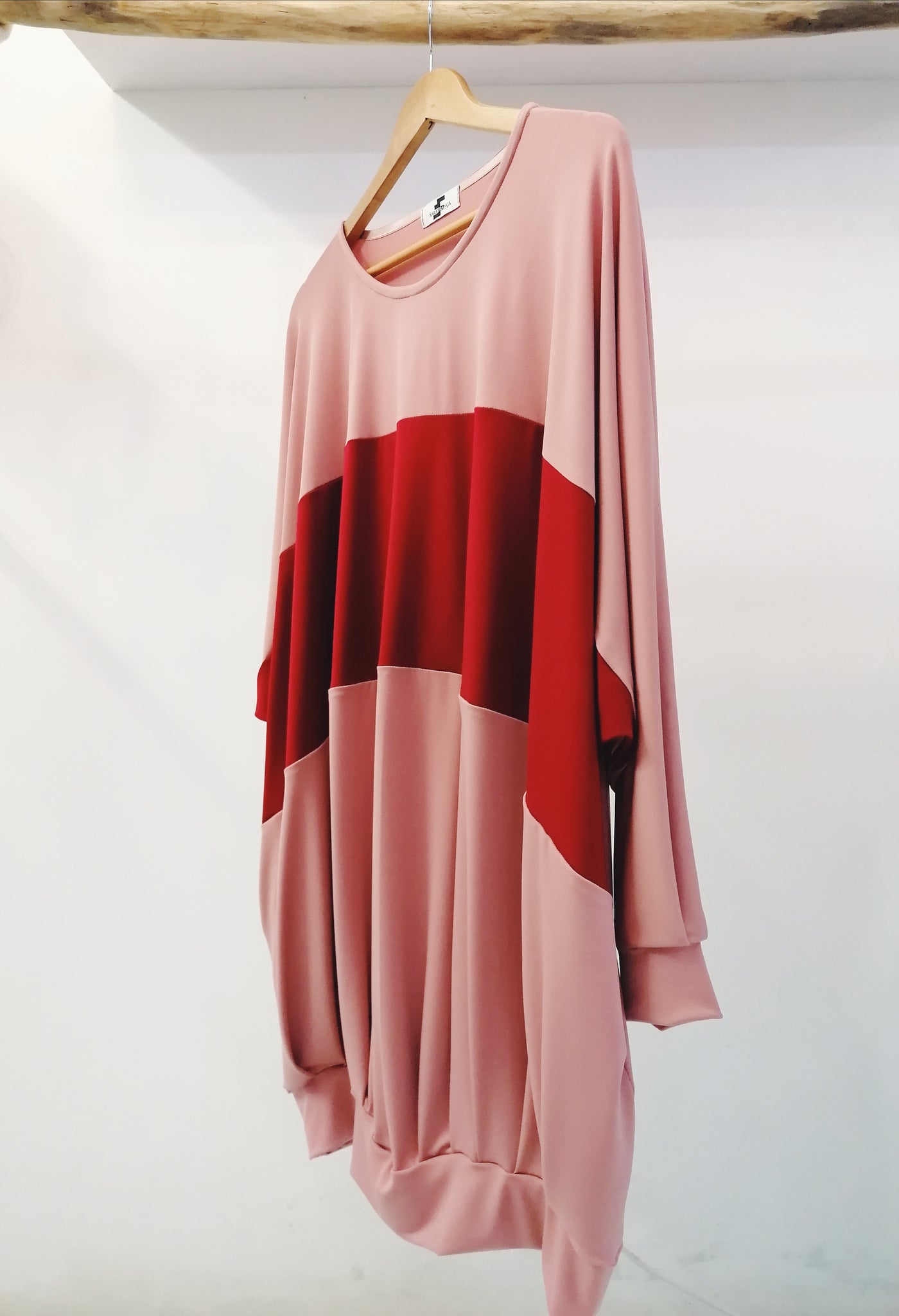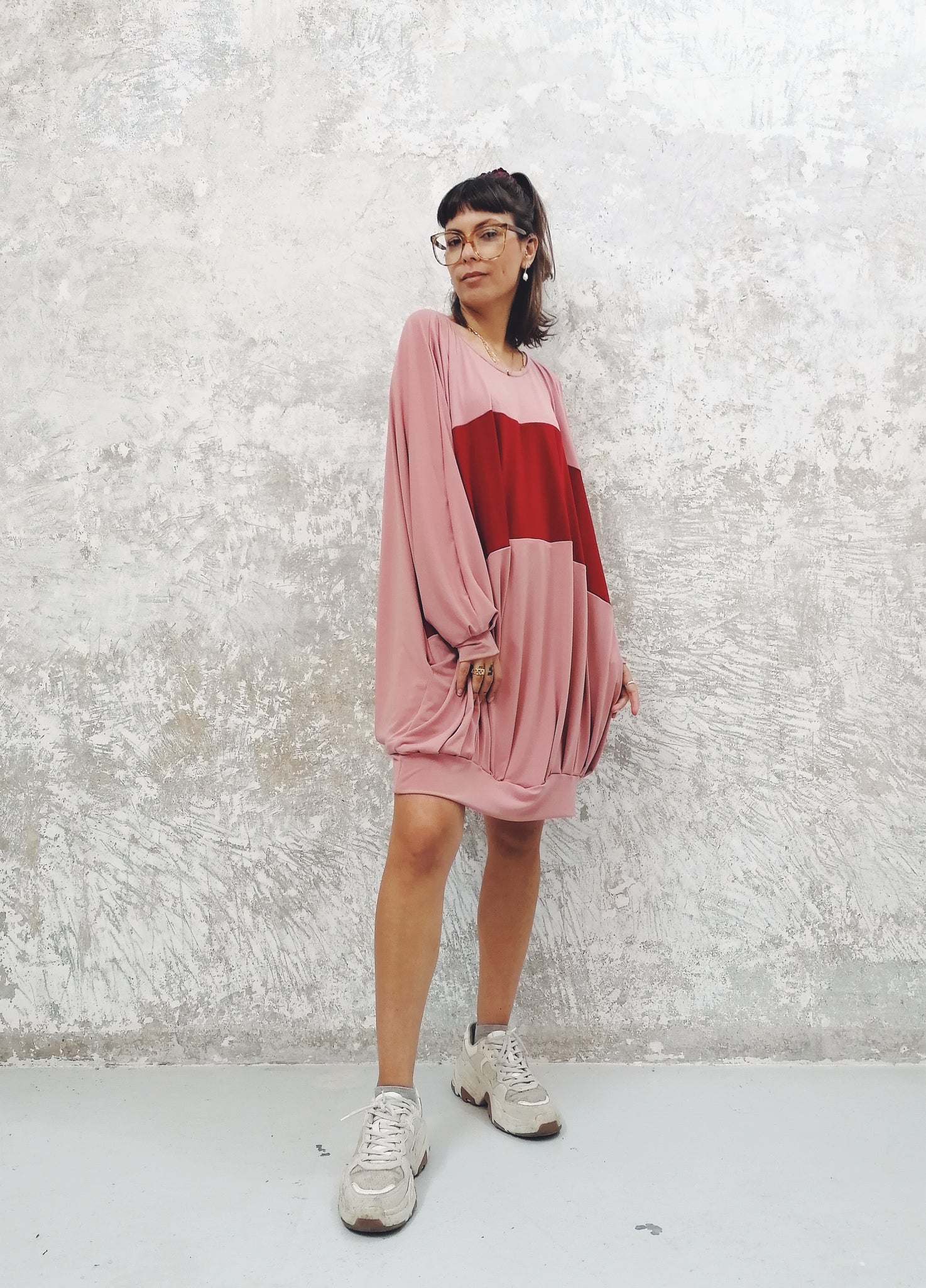 Pleated hoodie dress in a fresh and thin knitted fabric with two pockets on the sides.