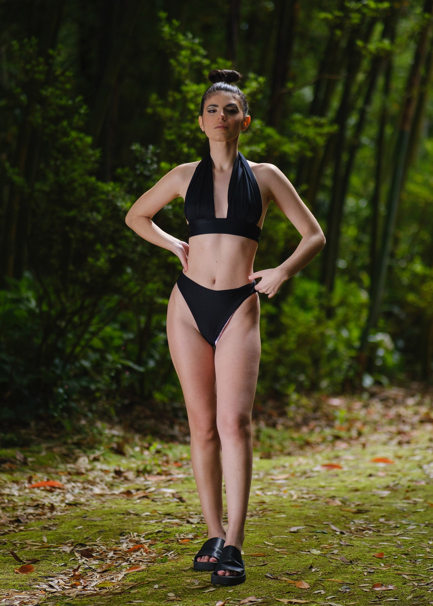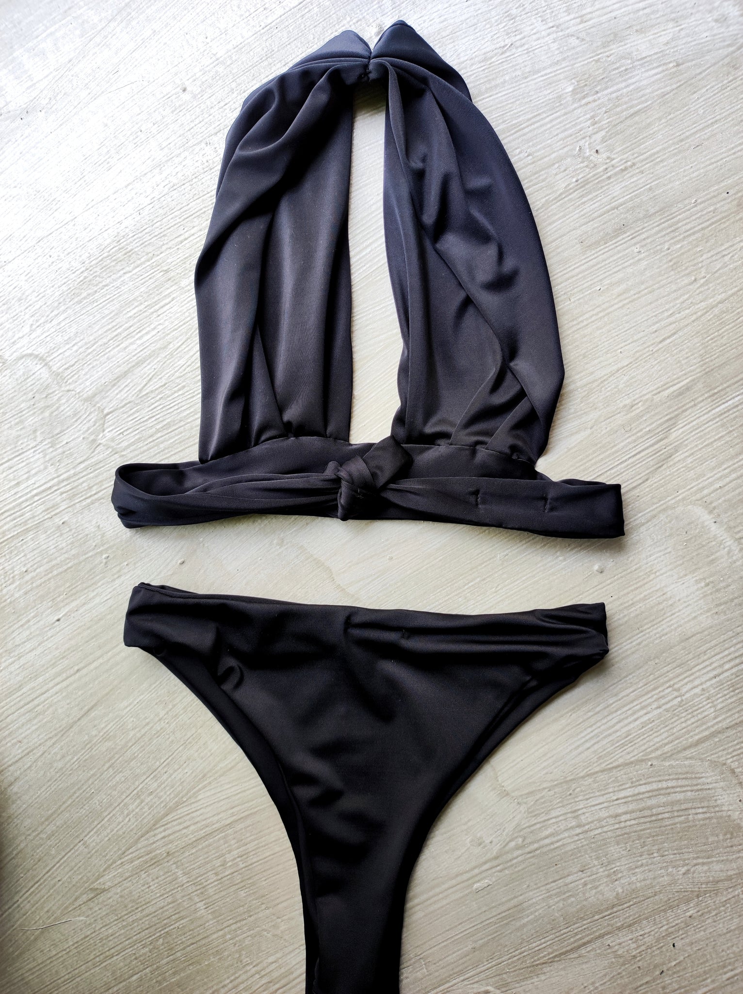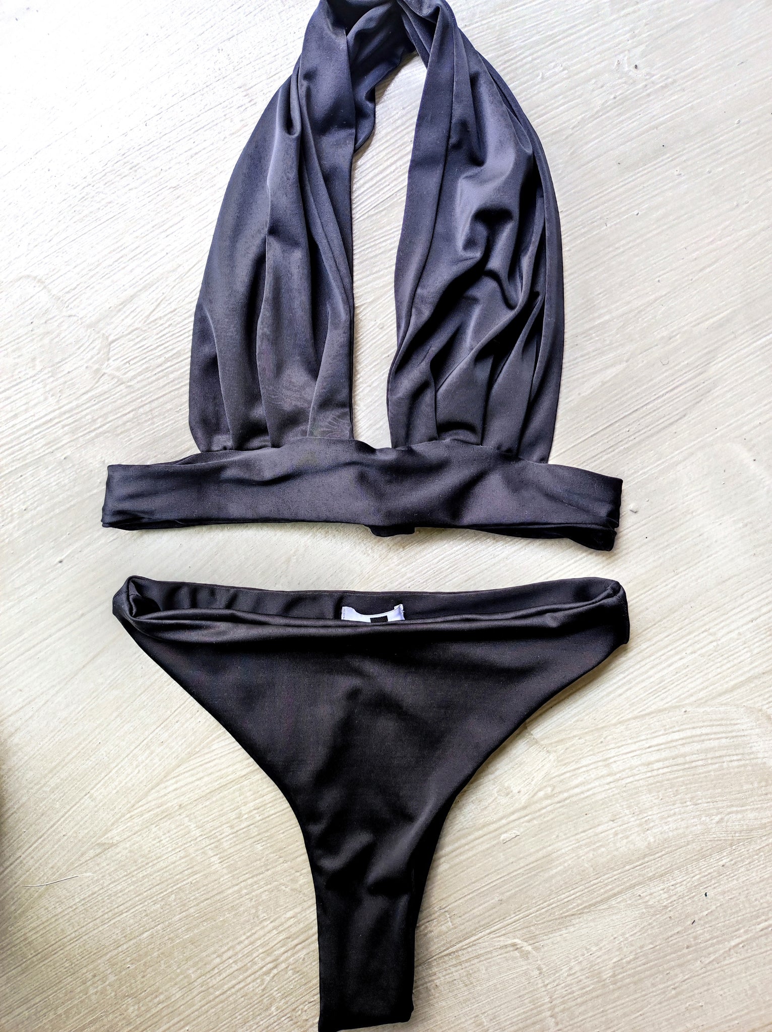 Bikini with pleated on the top, bottom high waisted and low cut on the back.