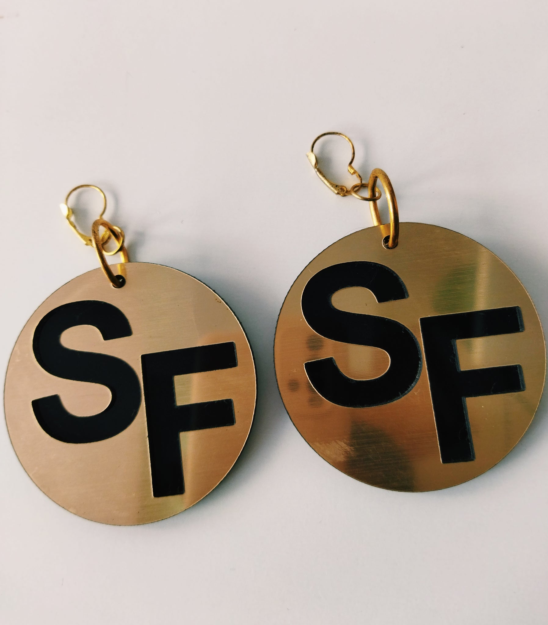 Acrylic earrings with black on the back and gold in front with 6cm diameter.