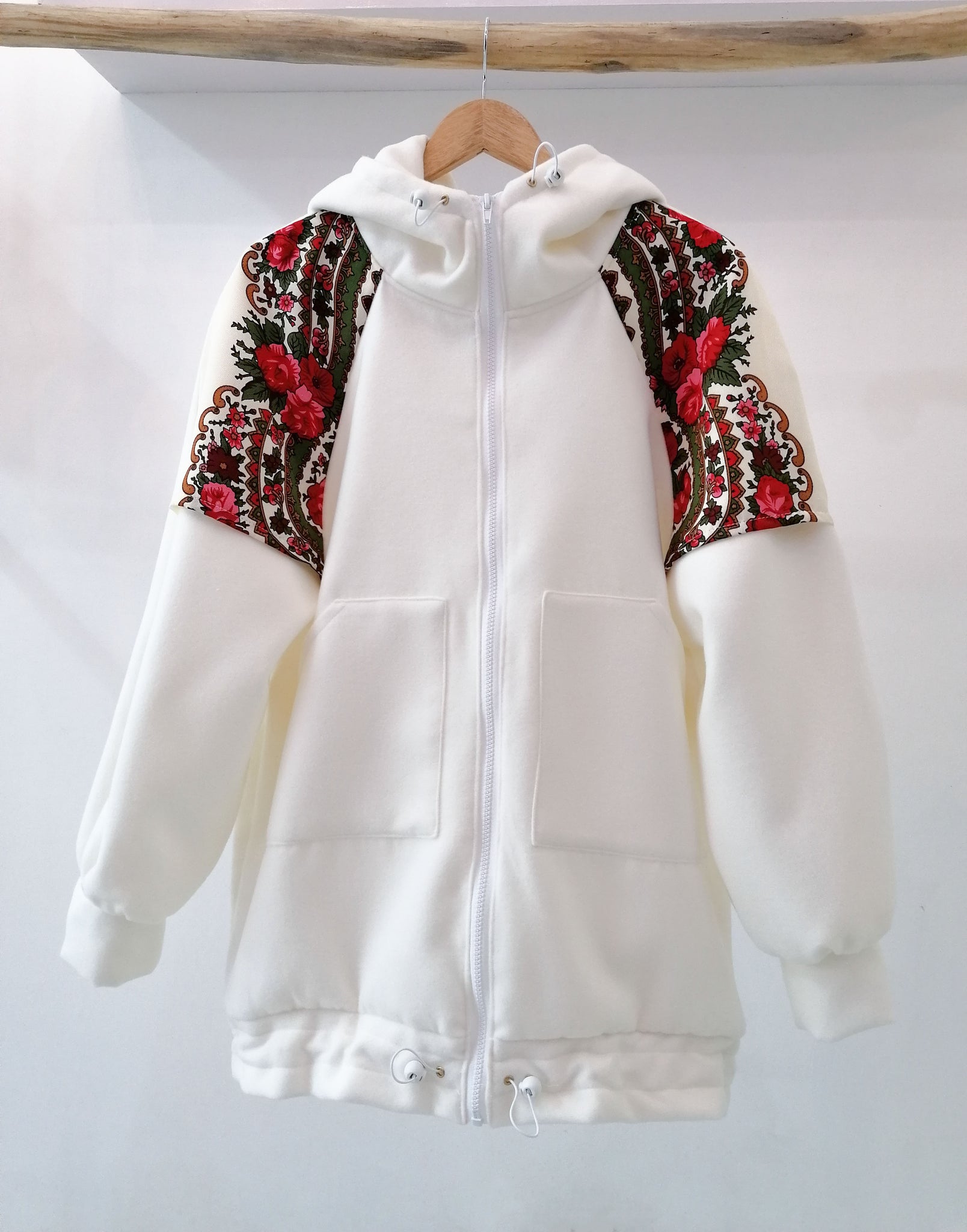 This coat is super comfortable and warm with sporty details. So unique and beautiful. White oversized coat with traditional details on the sleeves.